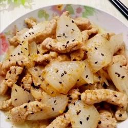 9. Heat the pot and add cooking oil , add onion and tenderloin, stir-fry evenly