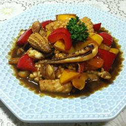 | Squid ( 1 ) | Red and yellow peppers ( appropriate amount ) |