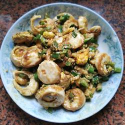 6. Heat oil in a pan, add green pepper, garlic cloves and onions, saute until fragrant, then pour in eggs.