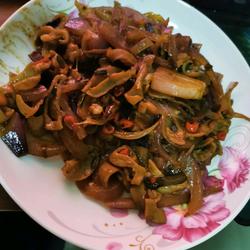 2. Remove the cooked large intestine and cut it into strips.Add oil and green onions first, then add the chopped onions and stir-fry over high heat.