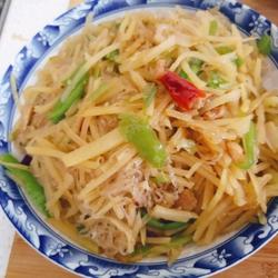10.Wait for the potato shreds to appear When it turns transparent, add salt, chicken essence and chicken powder and continue frying