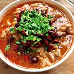 8.Pour the meat slices and soup into a large bowl lined with bean sprouts, and sprinkle with Pre-fried dried chili peppers and dried Sichuan peppercorns.