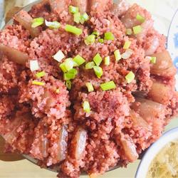 3.Put an appropriate amount of steamed pork rice noodles into the marinated meat and mix well.Make sure that every piece of meat is mixed with steamed pork rice noodles.