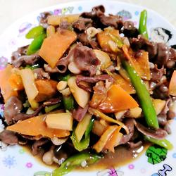 7. Set aside the pig heart and add ginger, onion, garlic, green pepper and carrot slices Stir-fry until fragrant...