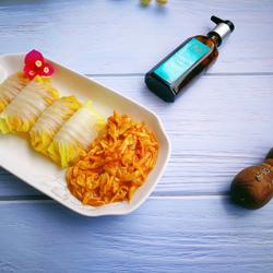 7. Put the appropriate shredded pork sauce on one side of the cabbage leaves, and remove it from the leaves.Start rolling, wrap both sides in, and continue rolling.