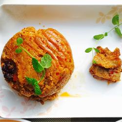 5. Put the meat skin side down and put it into the bowl, so that it looks beautiful.Bring to a boil, steam over medium heat for two hours and serve.Don't be reluctant to add water, as it may dry out over time.After it's out of the pot, take a large, beautiful plate, turn the meat upside down, and the dish is ready.It's beautiful and enjoyable to feast on your palate and entertain your guests.