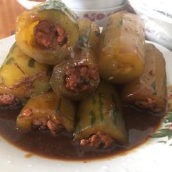 6. Fry one end of the stuffed meat lightly in vegetable oil, add water, ginger slices, Dark soy sauce and light soy sauce are boiled over high heat and simmered over low heat.