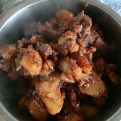 6. Heat the oil in a pan.When the oil boils, add an appropriate amount of aniseed.Stir-fry some shredded ginger until fragrant.Add an appropriate amount of pepper noodles and soy sauce.When done, add the meat pieces and stir-fry until the color changes.Then add the potato pieces and stir-fry for a while.I will add some dark soy sauce and stir-fry for a while, add some water and simmer for a while.When the pot is simmering, add an appropriate amount of cooking wine, 2 spoons of soybean paste, add some more when it is simmered, 2 spoons of MSG and minced garlic and you are ready to eat