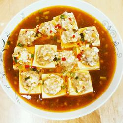4.Crush the scooped tofu into pieces, mix with the meat filling, stuff an appropriate amount into the scooped tofu cubes, and steam in a steamer for 15 minutes Minutes