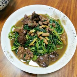 2. Cook the oil for about 10 seconds.Put down the chicken intestines and kidneys and fry for about 1 minute.Order some cooking wine to remove the fishy smell