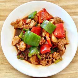 1. Prepare the materials, remove the bones from the chicken legs and cut them into pieces with a knife.Cut the bell pepper into cubes, cut the dried pepper into sections, and chop the garlic into minced garlic