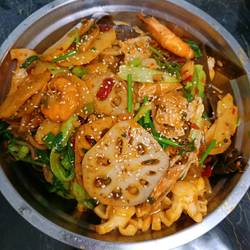 2. Wash all vegetables, cut and set aside, ( Devein the shrimps, cut the pork belly into thin slices, do not cut the lotus root slices and potato slices too thin, avoid frying them into pieces)