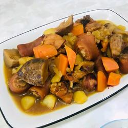 7. First blanch the rabbit and pig tails in hot water and add cooking wine to remove the smell.The blanched meat does not need to be boiled in cold water, but the water on the meat should be soaked up with absorbent paper and set aside.Add salad oil to the wok, add rock sugar, add the meat after the rock sugar browns, stir-fry over high heat until it becomes coloured, add onions, ginger, garlic, oyster sauce, soy sauce, stir-fry until the flavors are cooked, add the mushrooms and mushroom soaking water, bring to a boil over high heat Add potatoes and simmer for about 30 minutes.