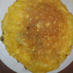 4.After about three or four minutes, if you can turn the spoon, just turn it.If you can't, just turn it.Cover the eggs with the disk, turn the wok over, and the eggs will be in the cavity of the disk.Gently push the eggs in the disk into the pot against the pot, and cook them on a low fire for a while.The pot will still be there.It needs to be shaken continuously, and it will be ready after a minute or two.At this time, gently push the egg pancake in the pot into the plate, and the dish will be ready.