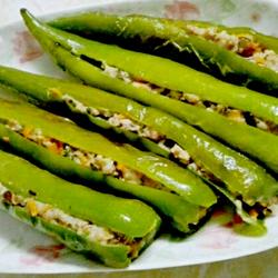 I've prepared too much meat filling.Convenient for next time.It can be kept in the refrigerator for a day or two.It would be just right if the peppers had more stuffing.Once the chili is fried, it won't be so hot.Just as delicious.
