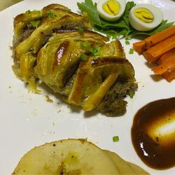 7. Place tin foil on the baking sheet, brush the contact surface of the tin foil with oil, and Remove the plastic wrap of the finalized steak bun and place it on tin foil.Decorate with another piece of puff pastry, coating it with egg wash (only egg yolk is used for the egg wash).