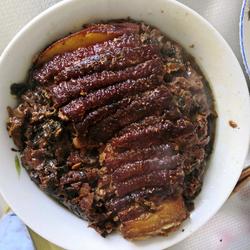 10. Place the pork skin side down, submerge the pork with prunes and steam it for 90 minutes