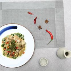 5. Take out the three-yellow chicken and cut it into strips, spread it on the okra, pour two spoons of chicken soup, sprinkle with millet pepper and green onions, and top with Tengjiao;