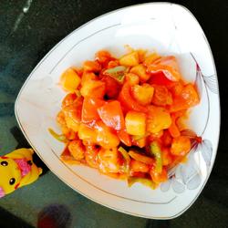 11. Put the colored pepper cubes and pineapple into the pot, stir-fry quickly and turn off the The fire comes out of the pot.