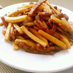 7. Fry until the shredded meat becomes hard and the color becomes golden.Add onion, ginger and garlic and stir-fry until fragrant.