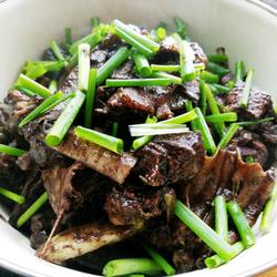 5. Add cold oil to the hot pot.When the oil is hot, add star anise, cinnamon and peppercorns and stir-fry After it is fragrant, add the duck meat and stir-fry until the surface is golden brown.Add a little light soy sauce, green onions, garlic, and garlic leaves and continue to stir-fry for 1 minute