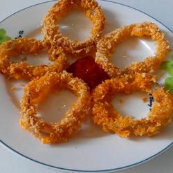 5.Put it into a bread crumb basin and coat it with bread crumbs.Wrap each round onion ring according to the above steps and set aside