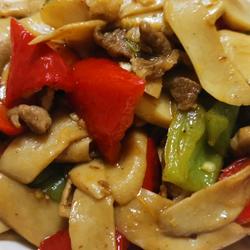 9.Pour in the chicken legs Stir-fry the mushrooms for two minutes, then add the just-fried lean meat, add a splash of water for ten seconds, turn off the heat, pour in the oyster sauce and the freshly prepared juice, stir-fry evenly, and serve.