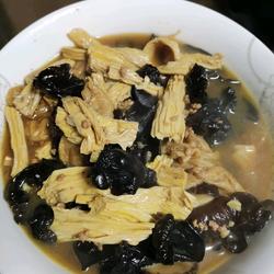 6.Add water, add mushrooms and fungus, season with light soy sauce and dark soy sauce to adjust the color.After the water boils, soak the gluten and yuba, boil over medium heat for a while until it suits your taste, and season with chicken essence.