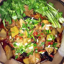 8. Pour the oil into the pot.When it is 70% hot, add two spoons of Pixian bean paste.When the oil turns red, add all the ingredients in pictures 5, 6 and 7.Pan-fry until the aroma is very strong.Add the marinated chicken.Stir-fry several times and then add a small amount of cooking wine and soy sauce.When the chicken completely changes color, pour in cold water and cook for 20 minutes.After the water boils, cook for a while, add taro and soy sauce.Cook the mushrooms for another 20 minutes, remove from the pot, add chicken essence, pour into a plate and sprinkle with chopped green onion and coriander! Sichuan style taro roasted chicken is completed, add chili pepper according to personal taste