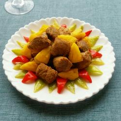 10. After the pineapple juice is released, add red pepper and green pepper.When the juice is almost reduced, add salt and Sugar to taste.