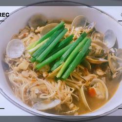 4. Fill the pot with water, and put the enoki mushrooms, clams, and vermicelli in order.