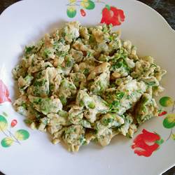 6. Heat the oil in a pan, heat the oil to 50% heat, pour in the egg and Chinese toon liquid and stir-fry