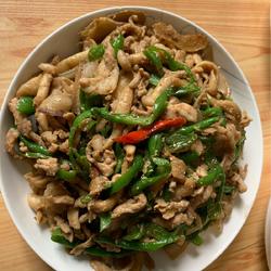 7. Add green peppers and fried shredded pork, cut green peppers and serve immediately Yes