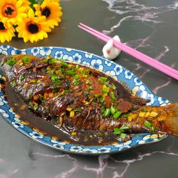 8.Put salt, sugar, vinegar, pour in the dark soy sauce used to marinate the fish just now, cover and cook for about four to five minutes.To cook the fish, of course, make sure that the minced meat in the fish belly is also cooked.If it's clear, add some MSG, add green onions, pour the fish with soup and put it in the pot.