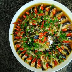 4.After 10 minutes, pour light soy sauce and steamed fish soy sauce out of the pot.Add an appropriate amount of chicken essence.Add two tablespoons of oil to another pot and add Sichuan peppercorns to heat.Drizzle until the fish body and add some vinegar.Yes
