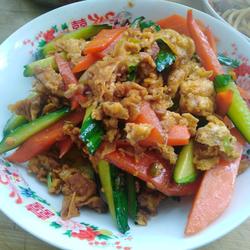 1. Cut cucumbers and carrots into diamond-shaped pieces, blanch the carrots in water, beat eggs until foamy, add chopped green onions and mix well