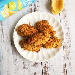 8.Finally covered with crispy potato chips, place the grilled wings on a baking sheet, and place a piece of oil paper or tin foil on the baking sheet below