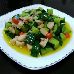 5.After the diced chicken changes color, add the cucumber and stir-fry evenly