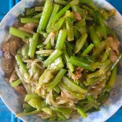 7. Stir-fry the meat slices until raw, add chopped green onion and ginger.