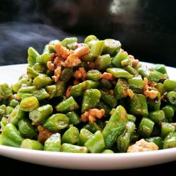 5. Stir-fry the minced meat until fragrant, add silkless beans, salt, Stir-fry with light soy sauce.