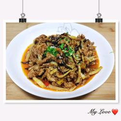 7.Add shredded winter bamboo shoots and shredded fungus and stir-fry for about 3 minutes, then Add the prepared sauce, mix the shredded pork with the sauce, stir-fry for another 1 minute, then remove from the pan and serve.