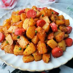5.Put a little oil in another pan, fry the diced potatoes until the surface is brown, and serve..