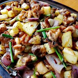 12.Add diced chicken, onions and potatoes in turn and stir-fry.