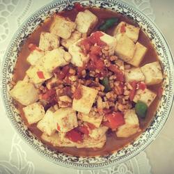 7. Pour tomatoes, peppers, tofu, salt and soy sauce into the pot and stir-fry