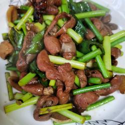 6. Heat the pot and add oil, add ginger, garlic, Sichuan peppercorns and star anise and sauté until fragrant, add the fat sausage, After the stir-fry is slightly sticky, add cooking wine and then spray it with water.After the cooking wine has basically evaporated, add light soy sauce and dark soy sauce and continue stir-frying.At this time, add some water to the pot, add pepper and green onions and stir-fry, then add garlic moss and stir-fry until After the soup is thickened, season with chicken essence and salt.