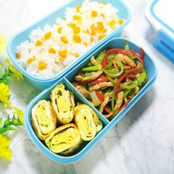 Recipe for Tamagoyaki bento with green pepper and shredded pork