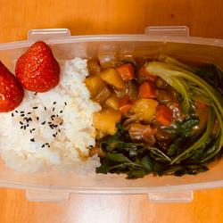 7.Finally, put the rice into a lunch box, sprinkle cooked black sesame seeds on the rice, pour the cooked curry on the rice, and garnish with coriander.In addition, some after-dinner fruit - strawberries.This is a picture of the finished product.