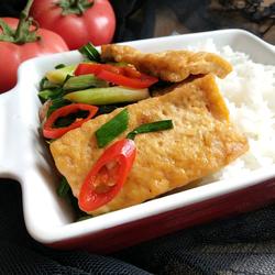 3.Put the fried tofu in a hot pan until golden brown on both sides, remove and set aside.