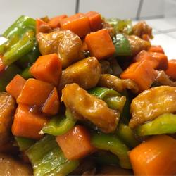 3.Pot Pour oil into the pan and fry the chicken until it changes color.Tip the carrots into the peppers.Fry for 30 seconds and remove to control oil.
