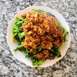5. Heat the pot, add 20% of the oil, add the eggs, mix quickly, set aside, then add an appropriate amount of oil, add the chopped green onion and minced garlic, saute the light soy sauce until fragrant.Add an appropriate amount of soybean paste, sugar, and a little water to the pot.Stir the fried eggs and chicken essence into the pot